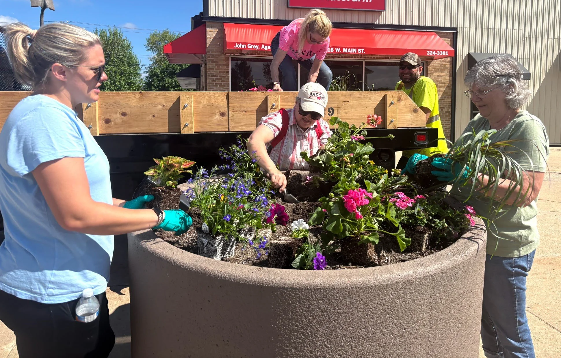 On Friday, May 30, 2025, the Mayville Downtown Planter Project brought together five Dodge County Master Gardeners, four community volunteers, two youth Master Gardeners, and the Mayville Park Department supervisor to install this year’s plantings in the downtown containers.